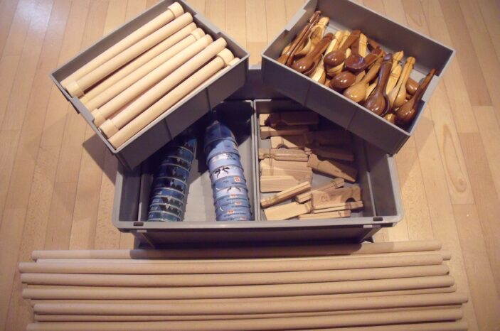 Die Perkussionskisten beinhalten Löffeli, Chlefeli, Becher und Stäbe (inkl. CD, DVD mit Anleitungen und Hintergrundinformationen) und können für Schulklassen oder andere Gruppen beim Haus der Volksmusik gemietet werden.